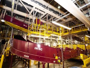 “Mail comes in off the dock, gets loaded onto a mail dumper, which sends the mail through a maze of conveyors and onto a singulator, which shuffles all the mail into a single file line to be read by a scanner, which tells the system which chute to dump it out on,” Sarenana said. “This project builds on the original tilt-tray system that runs on a chain, with a lot of the conveyers being upgraded to powered roller conveyors.”