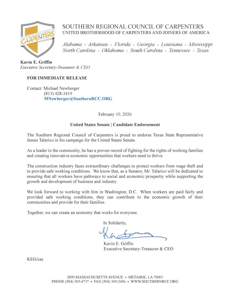 “The Southern Regional Council of Carpenters is proud to endorse Texas State Representative James Talarico in his campaign for the United States Senate.
