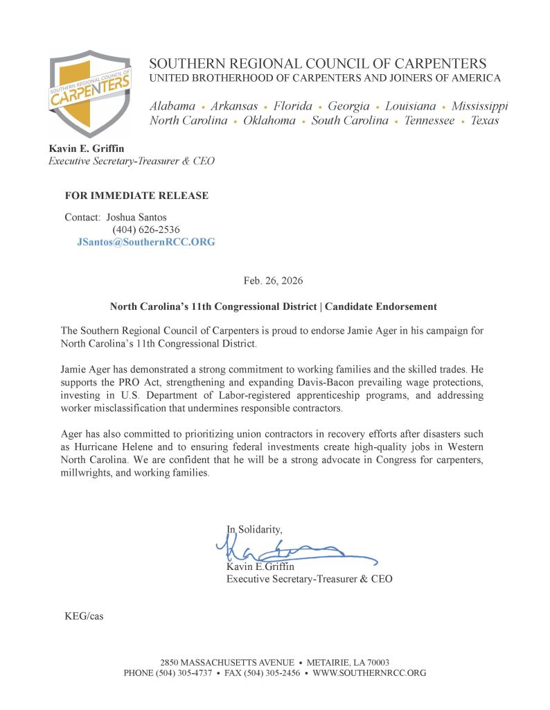 The Southern Regional Council of Carpenters is proud to endorse Jamie Ager in his bid for North Carolina’s 11th Congressional District. Ager is a fourth-generation farmer and small business owner from western North Carolina who supported community rebuilding efforts after Hurricane Helene.