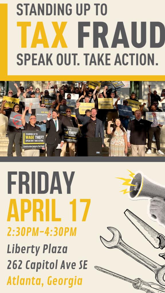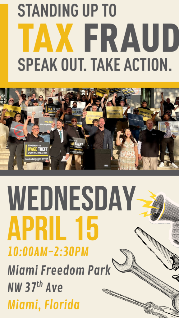 The Southern Regional Council of Carpenters is preparing for a demonstration in Miami, FL and Atlanta, GA for the Tax Fraud Days of Action. We are bringing attention to the growing problem of employer tax fraud in the construction industry, across the United States tax fraud committed by construction contractor’s costs states and federal treasuries $10 billion a year.